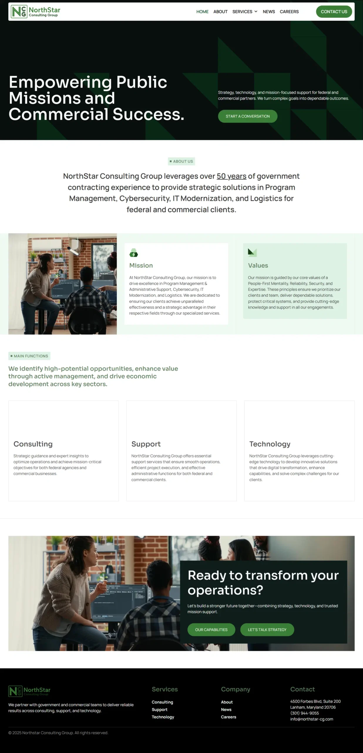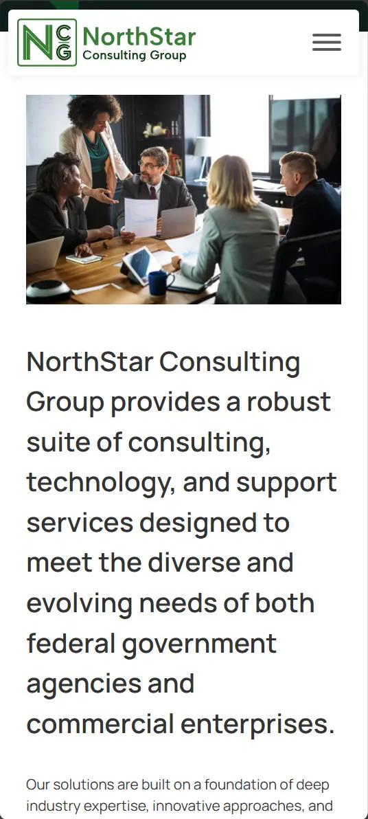 2025NorthStar Consulting Group (NorthStar CG) is a woman-owned and veteran-owned small business based in the Washington, D.C. region that provides consulting and technology services primarily to the U.S. federal government sector. The firm brings more than 50 years of cumulative government-contracting experience to bear and offers expertise in areas such as program management, cybersecurity, IT modernization, and administrative support. With a mission to help agencies and organizations navigate change and execute mission-critical operations with agility and integrity, NorthStar CG pairs strategic insight with technical know-how to deliver tailored solutions that support transformation, compliance, and operational excellence.